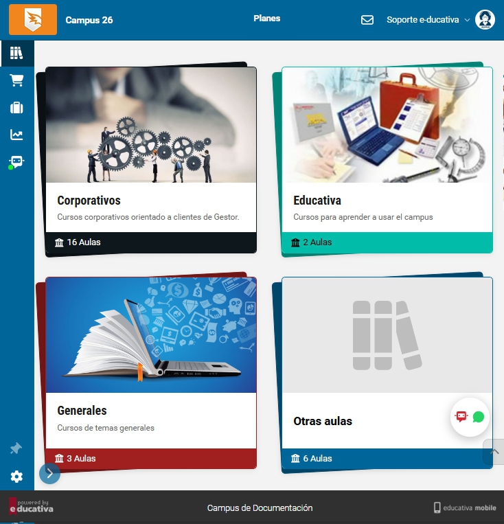 En este menú se definen los planes del campus. El objetivo es permitir que los campus que trabajan con múltiples proyectos educativos puedan agrupar sus aulas en Planes, mejorando la navegación del escritorio. El usuario ve sus planes como bloques visuales y con un clic accede directamente a las aulas de ese proyecto.