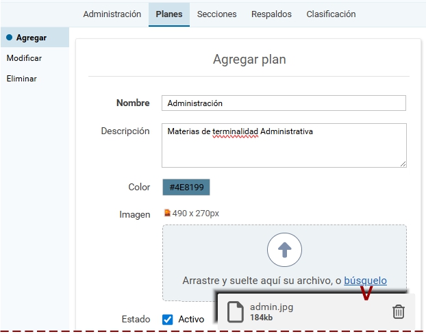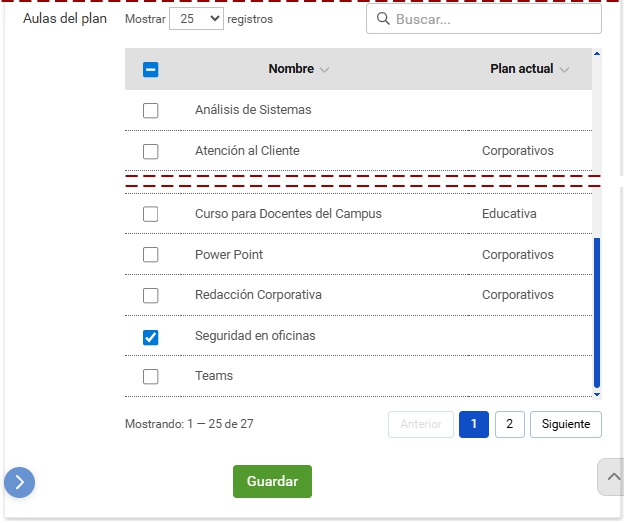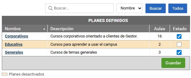 + Estado: estado del plan. Al desactivar un plan, desaparece del escritorio de los usuarios. Las aulas mantienen su asociación; si el plan se reactiva, vuelven a aparecer.