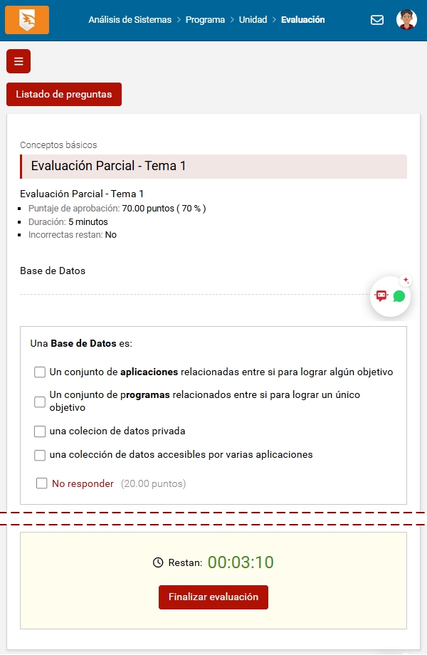 Al ingresar aparecerá un reloj con los minutos y segundos restantes para la finalización de la evaluación.